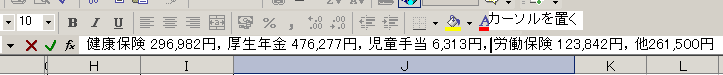 例えば、上のように説明が1段で長くなってしまい、労働保険から2段目に改行したい場合には、数式バーで労働保険の労の前をクリックしてカーソルを置き、Alt(オルト)キーを押しながらEnter(エンター)キーを押します。